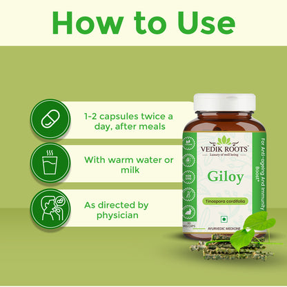 Introducing Vedikroots Giloy Capsules, a natural Ayurvedic supplement for overall health and wellbeing. Giloy, also known as Amrita or the "root of immortality", is a powerful herb that has been used for centuries in traditional Ayurvedic medicine.