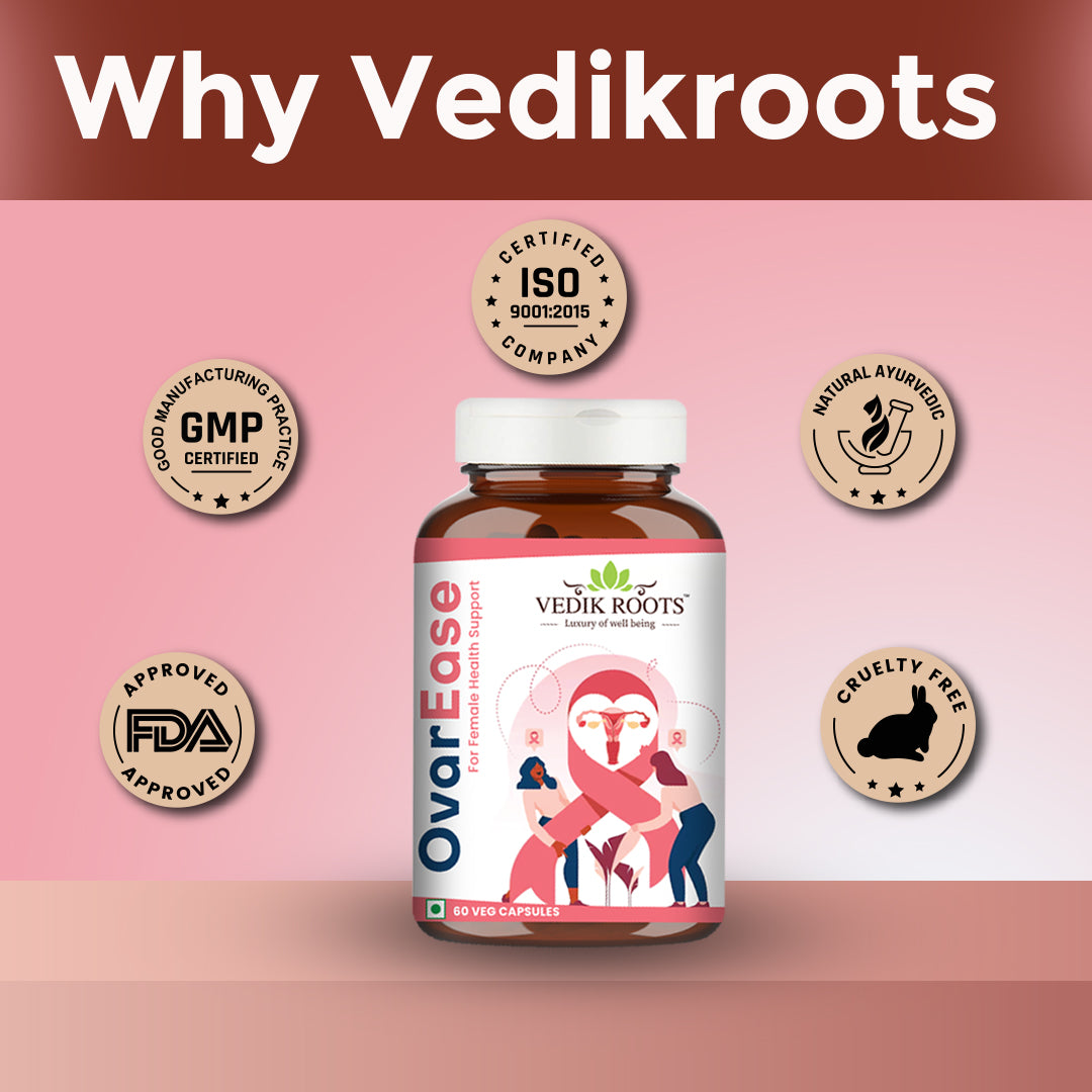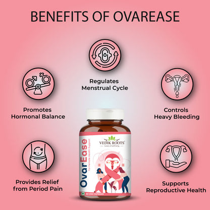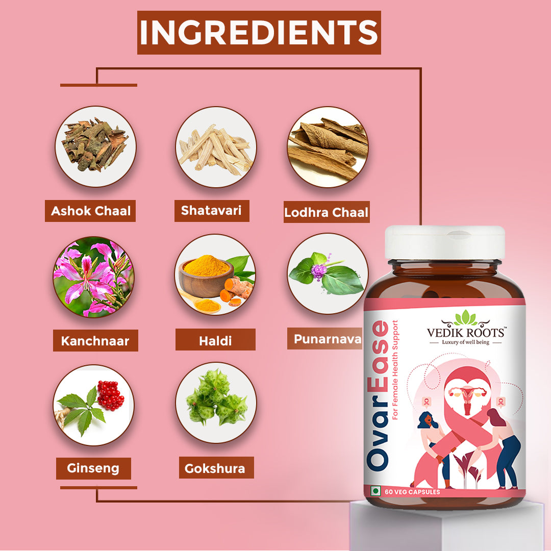 OvarEase is an Ayurvedic medicine for irregular periods, carefully formulated with natural ingredients to provide a safe and effective solution without any side effects. While OvarEase is made from natural ingredients, it's essential to follow the recommended dosage and consult with a healthcare professional before use.Key Ingredients