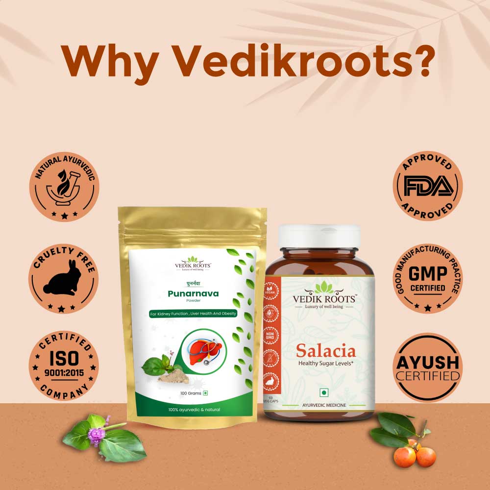Vedikroots Salacia is one of the top Ayurvedic medicines for diabetes management. The natural components found in Salacia are believed to slow down the absorption of carbohydrates and decrease appetite. They also help control blood sugar levels. Salacia Capsules also aid in boosting metabolism and combating symptoms of uncontrolled sugar levels like increased urination, thirst, lethargy, and exhaustion.